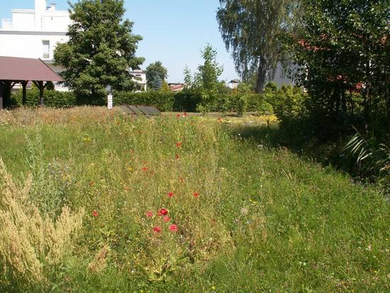 Łąka to kolejne miejsce na ścieżce, przy którym należy zatrzymać się na dłużej. Zaobserwujemy tutaj szereg ciekawych roślin charakterystycznych zarówno dla łąk świeżych, jak i wilgotnych. Można tutaj wyróżnić dwie warstwy roślinności. Wyższą tworzą głównie trawy wysokie, takie jak: rajgras wyniosły, kostrzewa łąkowa, drżączka średnia. W niższej oprócz traw, np.: tomki wonnej, spotkamy rośliny zielne. Będą to przede wszystkim rośliny motylkowe, np.: komonica zwyczajna, cieciorka pstra, koniczyna łąkowa, ale nie tylko. Już od kwietnia na łące pojawiają się niebieskie kwiaty przetacznika ożankowego a w czerwcu łąka mienić się będzie wszystkimi odcieniami koloru żółtego, czerwonego, fioletu i różu. Zobaczyć tu możemy np.: bodziszka łąkowego, dzwonka rozpierzchłego, chabra łąkowego i jastruny (złocienie) właściwe.