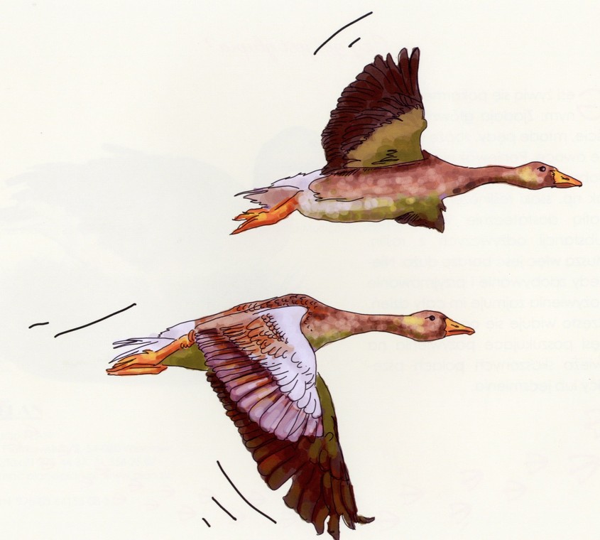 Wędrujące gęsi lecą tworząc klucz w kształcie litery "V", bywa, że jedno z ramion jest dłuższe. Podobnie lecą np. żurawie lub kaczki. Każdy ptak poruszający skrzydłami, stwarza coś w rodzaju powietrznej fali, na której unosi się jego sąsiad z tyłu. Dzięki temu stado może pokonać dystans o conajmniej siedemdziesiąt procent większy, niż gdyby każdy ptak leciał osobno. Gdy gęś, prowadząca stado, zmęczy się, przechodzi na tył klucza, a jej miejsce zajmuje inna. Gęsi lecące z tyłu gęgają od czasu do czasu. Prawdopodobnie w ten sposób dodają otuchy prowadzącym stado, pomagają utrzymać tempo. Z całą pewnością świadczy to o zdolności komunikacji wśród osobników gęsi, a to już jeden z dowodów na ich inteligencję.