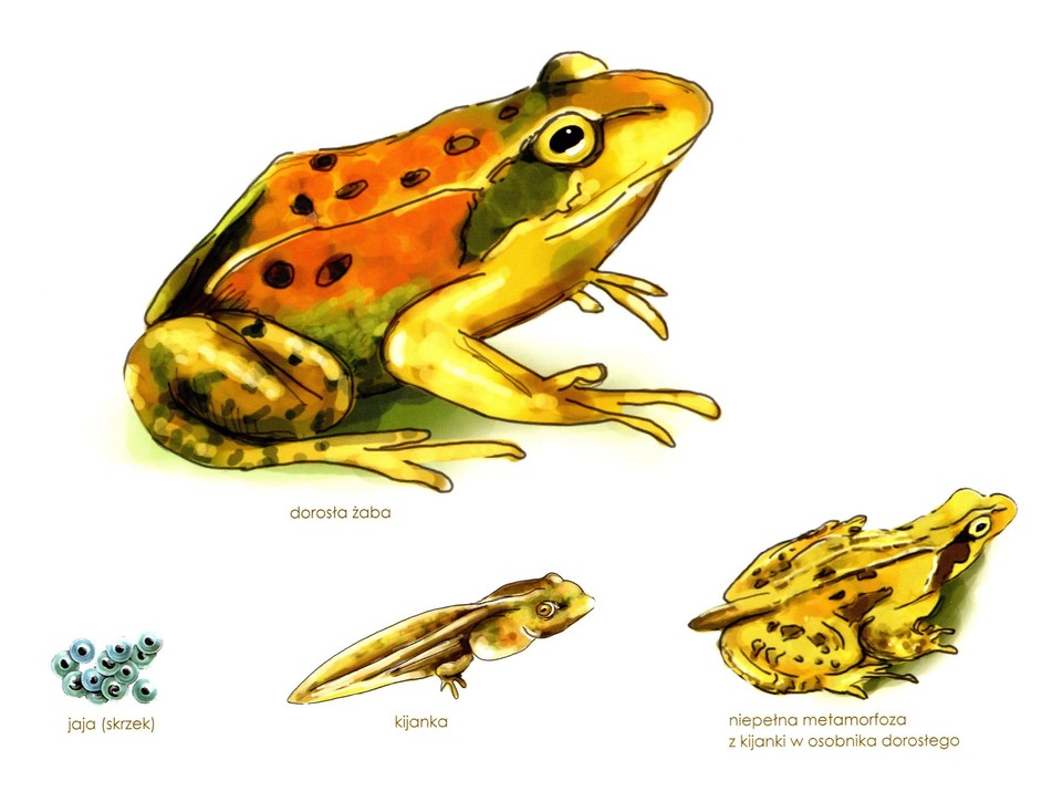 Wiosna to okres godowy wszystkich polskich żab. Samica składa do wody dużą liczbę jaj sklejonych galaretowatą substancją, czyli skrzek. Z jaj wylęgają się larwy - kijanki, które różnią się znacznie od dorosłych płazów. Żyją w wodzie, mają skrzela i ogon. Po pewnym czasie u kijanki pojawiają się kończyny tylne, a następnie przednie. Potem kijanki tracą ogon, pojawiają się płuca. Opuszczają wówczas wodę i zaczynają życie na lądzie na wzór swoich rodziców.