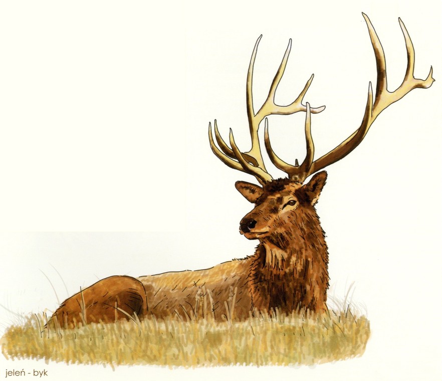 Jeleń szlachetny, król naszych lasów, występuje zarówno na nizinach, jak i w górach (aż do granicy lasów). Samiec jelenia, zwany bykiem, może ważyć nawet 160 kg. Jego „żona”, czyli łania jest o połowę, od niego, lżejsza. W ciągu roku samica rodzi jedno lub dwoje młodych, zwanych cielętami. W zależności od pory roku zmienia się pożywienie jeleni. Wiosną, latem i jesienią zjadają trawy, zioła, owoce krzewów i grzyby, natomiast zimą głównie mech, porosty a także gałązki i korę drzew.