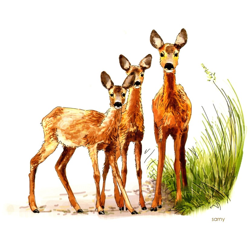 Sarny żyją zarówno w lasach jak i na polach uprawnych i łąkach. Są dużo mniejsze od jeleni. Samiec sarny nazywany jest kozłem i waży maksymalnie 25 kg. Samica sarny, czyli koza, w ciągu roku rodzi od jednego do trzech młodych, które zwą się koźlętami. Sarny odżywiają się głównie urozmaiconym pokarmem roślinnym (trawy, zioła, pędy jeżyn i malin) i grzybami. Lubią lizać sól i pić czystą wodę.