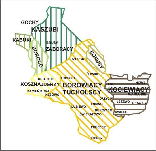 Przyrodnicza kraina Borów Tucholskich nie jest jednorodna pod względem kulturowym. Obszar ten po raz pierwszy został objęty naukowym badaniem etnograficznym w latach czterdziestych XX wieku przez ks. Bernarda Sychtę. W rozprawie pt. „Kultura materialna Borów Tucholskich” ks. Sychta udowadnia, że Borowiaków, którzy posiadają wiele swoistych elementów regionalnych, będących wynikiem wieloletniej egzystencji w zamkniętym obszarze leśnym, łączy dużo cech z Kociewiakami i Kaszubami. Szczególnie silnie wiążą się Bory Tucholskie z Kaszubami. Związek z Kaszubami zaznacza się w drewnianym budownictwie. Szczególnie widoczne jest to w podcieniach, konstrukcji dachu i ozdobach nadszczytowych. Drewniane chałupy zobaczyć można m.in. w Chocińskim Młynie, i Swornegaciach. Wspólna jest także łódź dłubanka, stosowana przez rybaków borowiackich i kaszubskich. Wyrazem tych silnych powiązań jest zróżnicowanie etniczne Borów Tucholskich. Północno - zachodni kraniec Borów zamieszkują Kaszubi, a wśród nich Zaboracy, Gochy, Kabuki i Boröce. Środkową część Borów zamieszkują Borowiacy Tucholscy, natomiast w części północno - wschodniej żyją Kociewiacy. Mieszkańcy Ziemi Zaborskiej zwani są Zaborakami, Krëbanami lub Krubaniami. Obszar na północny zachód od Charzyków, aż po granice zasiedlenia Gochów i Kabuków, zamieszkują Borowiacy Kaszubscy zwani inaczej Boröcami. W okolicach Konarzyn mieszkają Kabuki. Gochy natomiast mieszkają bardziej na północ, w rejonie wsi Brzeźno Szlacheckie, Borzyszkowy, Kiedrowice, Borowy Młyn, Lipnica, Zielona Chocina aż do naturalnej granicy z Zaborakami, którą stanowi rzeka Zbrzyca oraz ciąg jezior Laska, Księże, Długie i Parszczenickie. Zabory charakteryzują mniejsze wpływy niemieckie, w przeciwieństwie do okolic Chojnic, gdzie bardziej urodzajne gleby przyciągały już od XV w. zachodnich kolonistów. Wpływ kaszubszczyzny znajduje odzwierciedlenie w formach kultury ludowej i regionalnej.