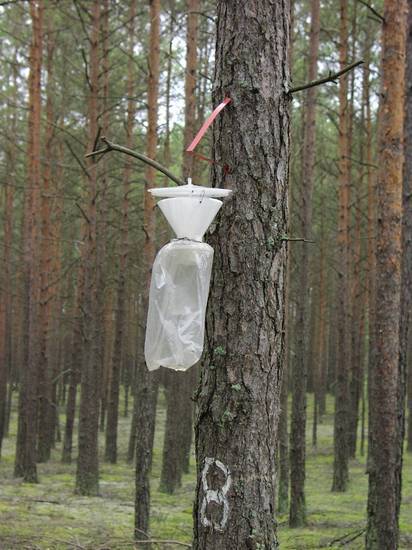 - szukanie jaj w drzewostanach najsilniej zagrożonych w wieku od 20-80 lat ( II–IV klasa wieku). Przeszukuje się szczeliny kory od odziomków drzew do wysokości 1,5 m,