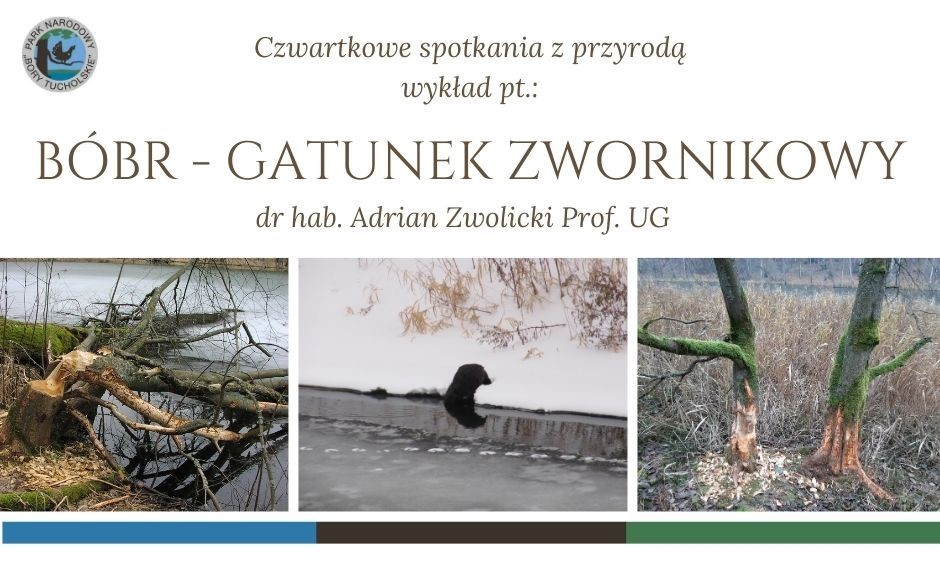 Park Narodowy „Bory Tucholskie” serdecznie zaprasza na wykład z cyklu Czwartkowe spotkania z przyrodą. Spotykamy się w czwartek 21 marca br. o godz. 18.00 w Centrum Edukacji Przyrodniczej Parku Narodowego „Bory Tucholskie” w Chocińskim Młynie (Chociński Młyn 5). Wykład pt. „Bóbr – gatunek zwornikowy” poprowadzi Pan dr hab. Adrian Zwolicki Prof. UG
