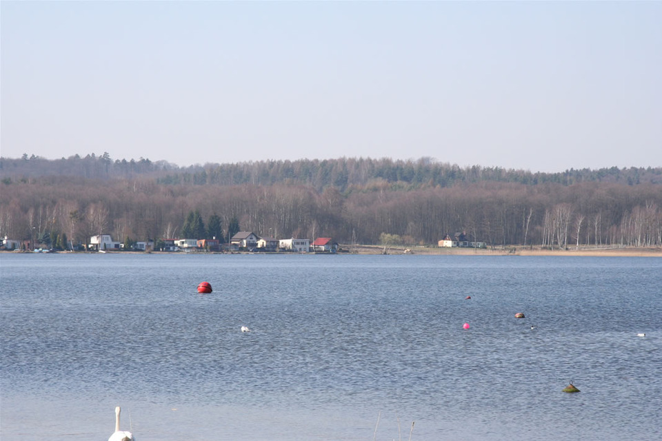 Teraz czerwony szlak prowadzi na północ wschodnim brzegiem jeziora Charzykowskiego. Jezioro Charzykowskie zwane także Łukomie jest drugim pod względem wielkości zbiornikiem wodnym w Borach Tucholskich. Jego powierzchnia wynosi 1363,8 ha, a maksymalna głębokość 30,5 m. Położone jest na wysokości 120 m. n.p.m. Leżące u krańców jeziora miejscowości Charzykowy i Małe Swornegacie dzieli wodą 9,5 km. Maksymalna szerokość jeziora wynosi 2,4 km, minimalna 0,5 km.