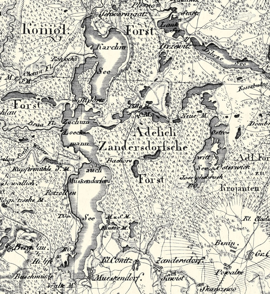 W ten sposób docieramy do „czarnej drogi”. Tu nasze szlaki krzyżują się z niebieskim szlakiem rowerowym biegnącym z Bydgoszczy do Chojnic. W tym miejscu kończy się również czarny szlak pieszy (Łącznikowy) z Drzewicza.