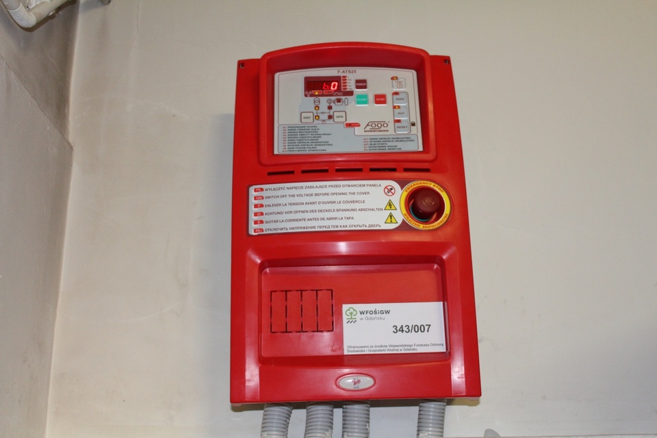 W ramach zadania zakupiono i zamontowano agregatu prądotwórczego FOGO FDC 20 MSA o mocy maksymalnej 22kVA (17,6 kW) i mocy znamionowej 20 kVA (16 kW), zasilany wysokoprężnym silnikiem spalinowym, w obudowie wyciszającej wykonanej z blachy stalowej, powlekanej warstwą antykorozyjną. Urządzenie zamontowano na uprzednio przygotowanym, zgodnie z wytycznymi producenta, fundamencie wykonanym ze zbrojonego betonu, na zewnątrz budynku. Agregat prądotwórczy został połączony kablem sterowniczym z automatycznym sterownikiem FAGO ATS 206, zlokalizowanym w budynku dydaktycznym, w pomieszczeniu przy kotłowni. W istniejącej rozdzielnicy głównej na zewnątrz budynku dokonano zabudowy sekcji obwodów rezerwowych i połączono je z układem SZR sterownika. Tak przygotowany system w razie wystąpienia przerwy w dostawie energii elektrycznej, w ciągu ok. 30 sekund od zaniku prądu, uruchomi automatycznie agregat prądotwórczy.